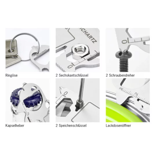 Petit outil multifonction en acier inoxydable de haute qualité et sablé proposant 14 fonctions : ouvre-bouteilles, tournevis plat, tournevis cruciforme, deux clefs hexagonales, mini-règle en centimètres et en pouces, ouvre-boîtes de peinture, arrache-clou, deux clefs à dents multiples, deux clefs à rayons pour vélo et un œillet.
