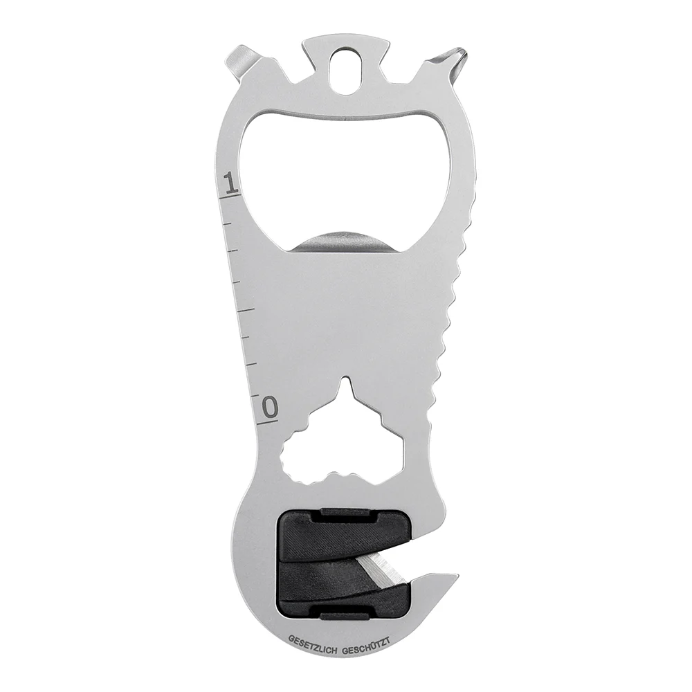 Outil multifonctionnel compact en acier inoxydable de qualité supérieure, sablé mat, avec 14 fonctions ; ouvre-lettres et ouvre-paquets interchangeables, 1 lame de rechange click-in, décapsuleur, tournevis plat, tournevis cruciforme, deux clés à rayons, trois clés hexagonales, clé multi-dents, arrache-clous, centimètre, pouce et œillet pour porte-clés