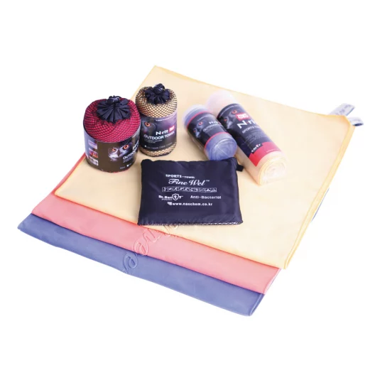 Serviette de sport agréablement douce en tissu microfibre de qualité supérieure, extra absorbante et à séchage rapide, avec surface spécialement traitée antibactérienne, emballée dans un étui noir en nylon/mesh, quantité minimale de commande 300 pièces.