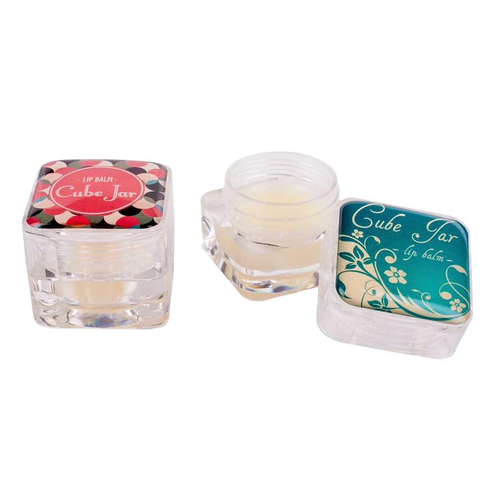 Baume à lèvres dans une boîte carrée, finition originale avec sticker en résine synthétique, cube transparent contenant env.