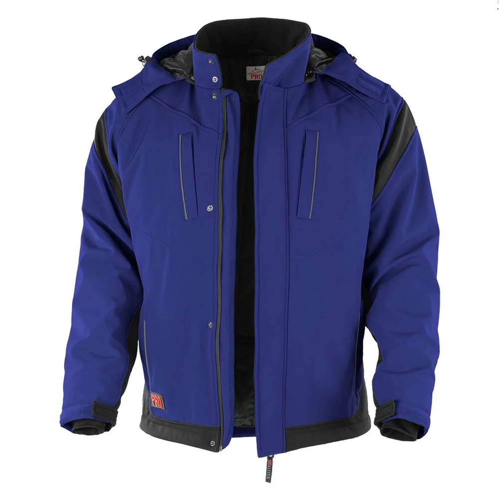 Veste softshell avec capuche amovible, col relevé avec 2 pressions, 2 poches de poitrine et 2 poches latérales avec fermeture éclair en plastique dissimulée, fermeture éclair à sens unique YKK dissimulée avec protection du menton et 4 pressions, bandes réfléchissantes.