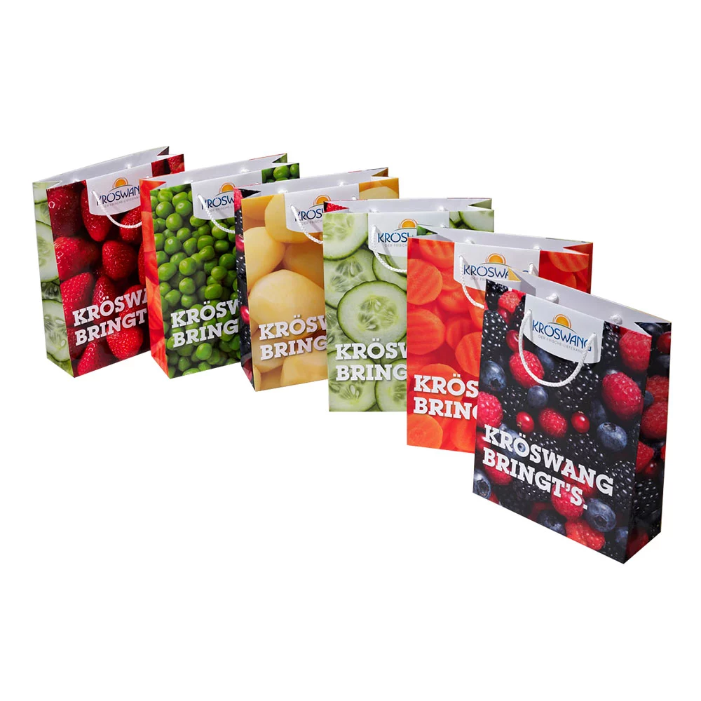 Sac en papier kraft FSC 170 g/m2 (revêtement mat ou brillant disponible), avec cordons en papier tressé, revers renforcé et fond en carton, également disponible en d’autres tailles (prix sur demande), commande min 500 pièces