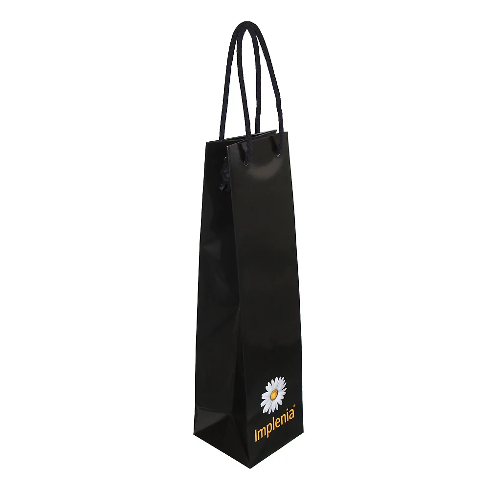 Sac en papier de commerce pour une bouteille, en papier Artpaper C2S 200 g/m2 (disponible en surface mate ou brillante), avec cordons en tissu, rebord renforcé et fond en carton introduit, volume de commande minimum 500 pièces