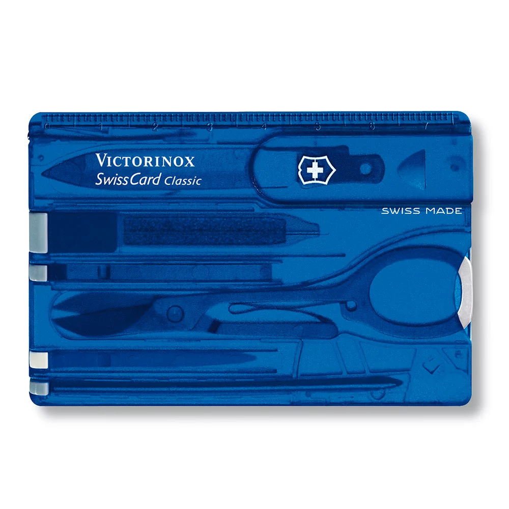 Outil pratique au format carte de crédit, signé Victorinox – avec ouvre-lettres, ciseaux, stylo, lime à ongles avec tourne-vis, pincette, cure-dents, aiguille et règle