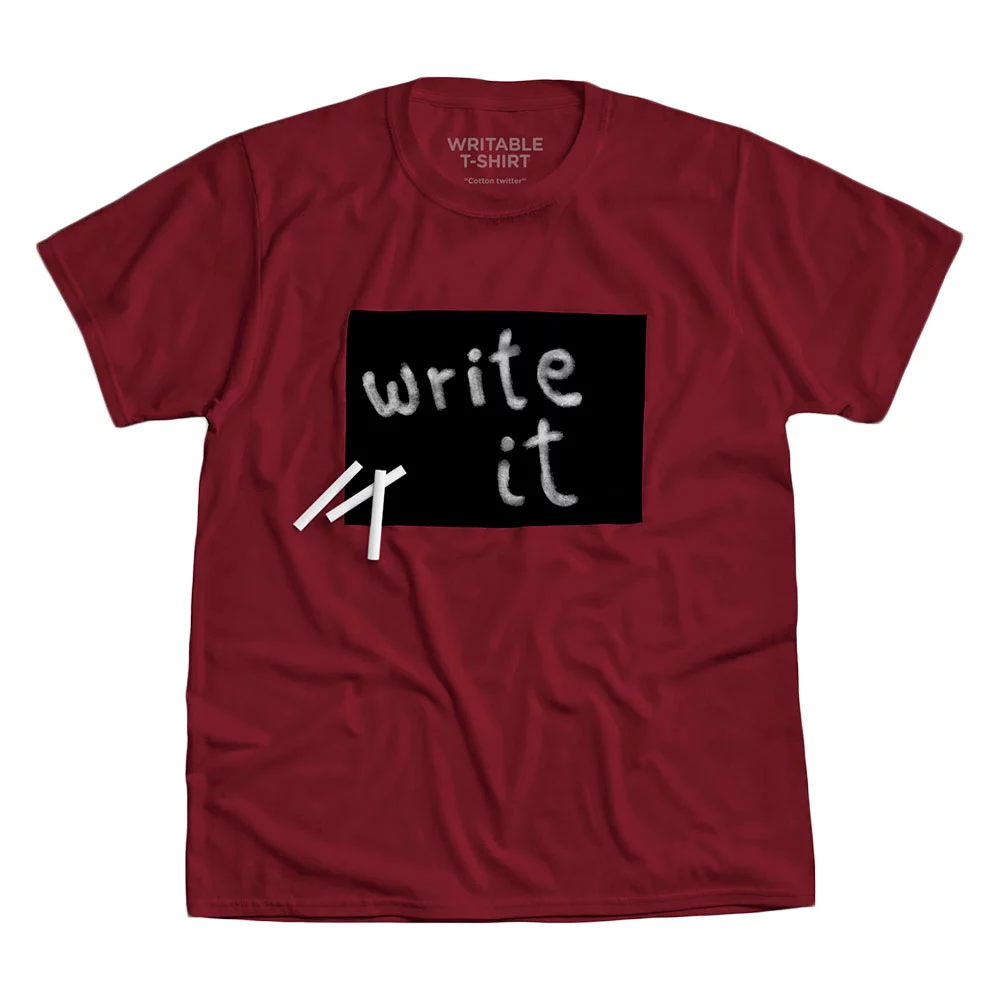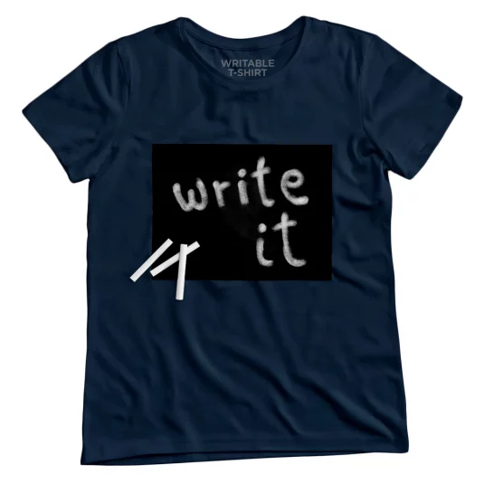 Un t-shirt avec un tableau noir destiné à y inscrire votre message à l’aide d’une craie blanche.