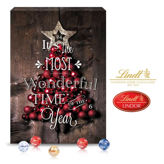 Le calendrier de l'Avent mural parfait, de qualité supérieure, rempli de 22 miniatures Lindt assorties et de deux figurines de Noël Lindt (env. 120 g), dans un emballage en carton plein au format portrait, avec trou de suspension et support de table, durée de conservation env. 6 mois