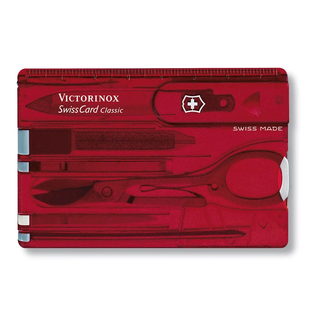 Outil pratique au format carte de crédit, signé Victorinox – avec ouvre-lettres, ciseaux, stylo, lime à ongles avec tourne-vis, pincette, cure-dents, aiguille et règle