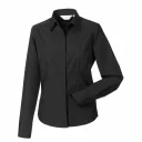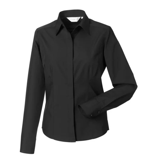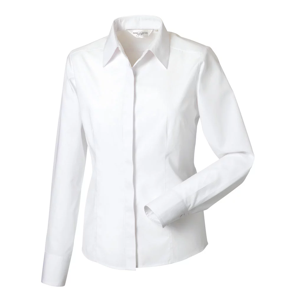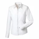 Chemise pour femme à manches longues en popeline, col classique, des pinces à l'avant et à l'arrière marquent la taille, barre de boutons recouverte, manchettes à 2 bouton, bord rond