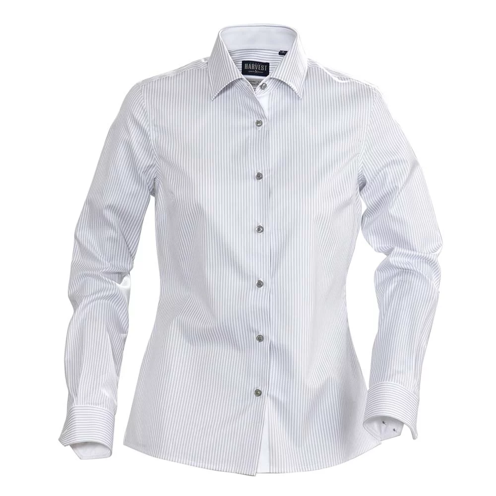 Chemisier classique en coton peigné avec traitement easy care. Coutures, col et manches renforcés. Motifs à rayures avec couleurs contrastées sous le col, sur la boutonnière et sur les manchettes. Coupe ajustée pour le modèle féminin.