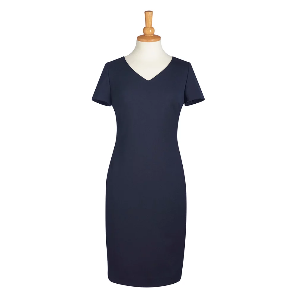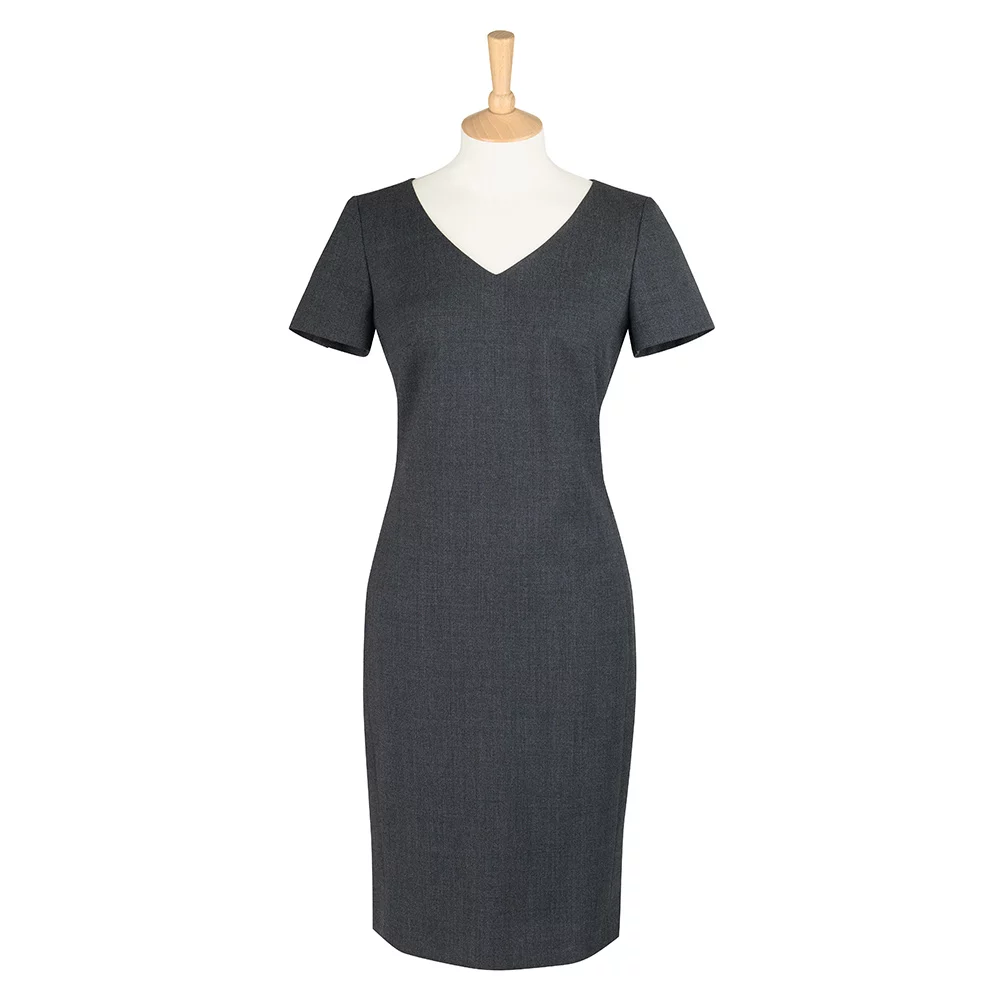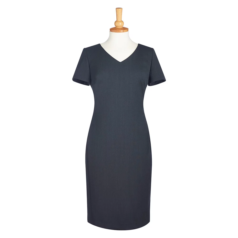 Robe élégante avec décolleté en V, manches courtes, fente dans le dos, doublure stretch, lavable en machine et infroissable.