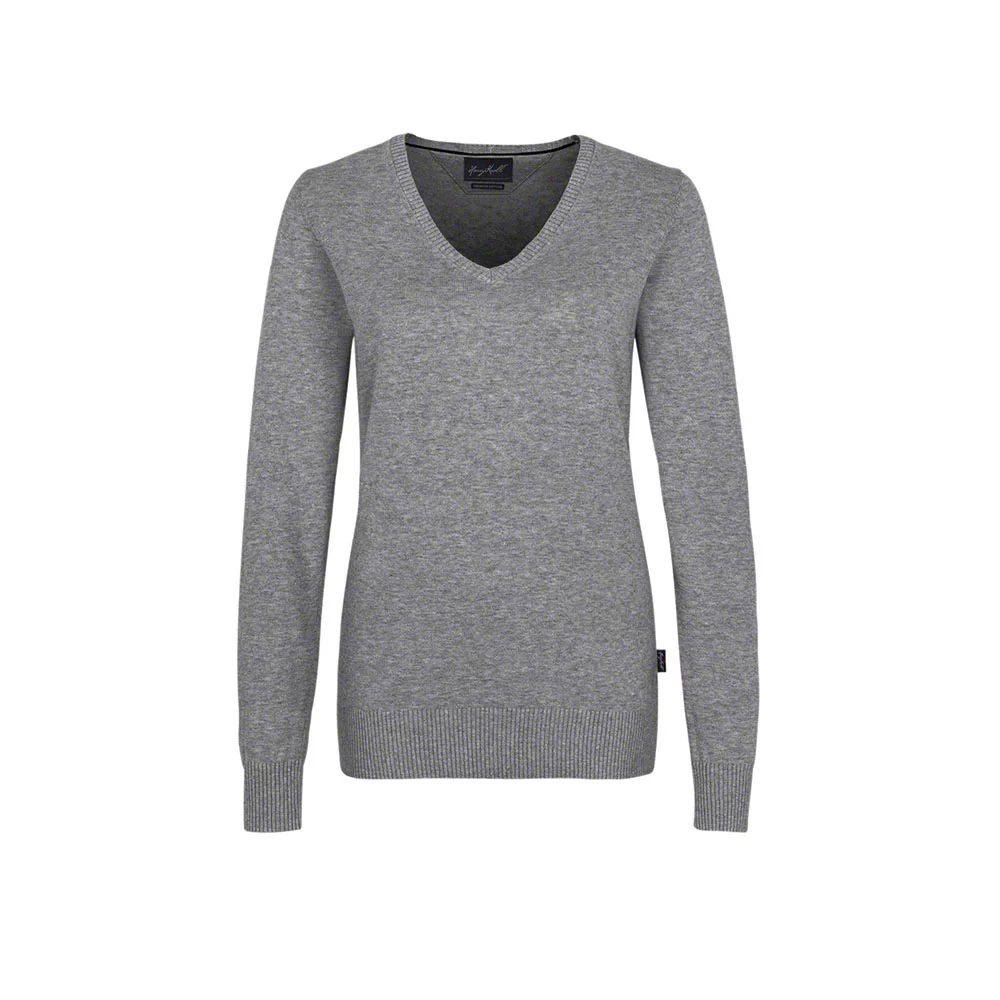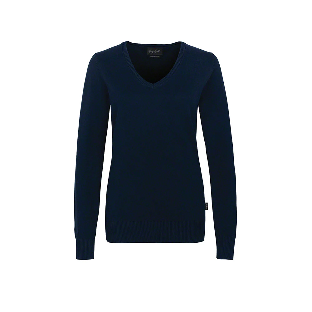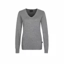 Pullover classique avec col en V, modèle dame légèrement cintré, poignets côtelés, bande contrastée tricotée sur la bande de col intérieure dans le dos et finition raffinée fully-fashioned.