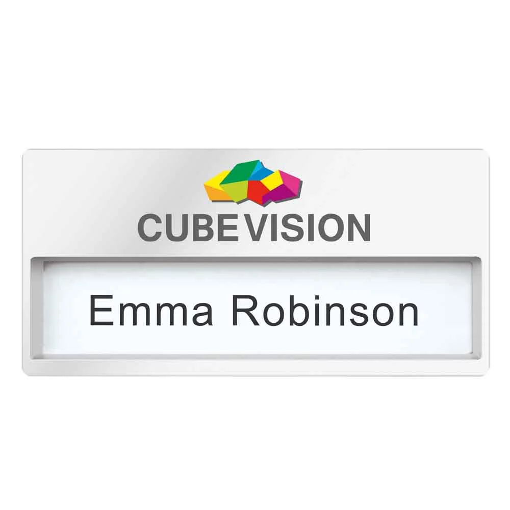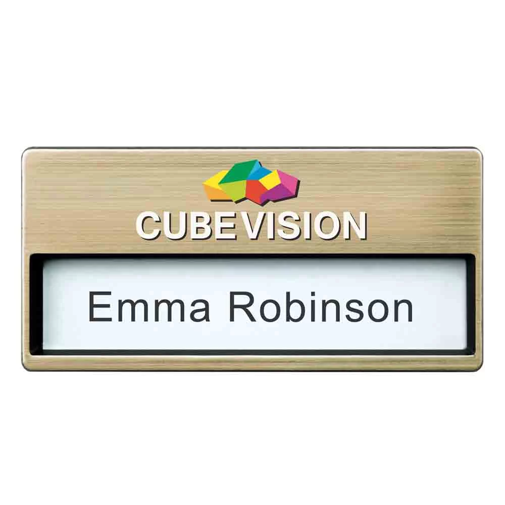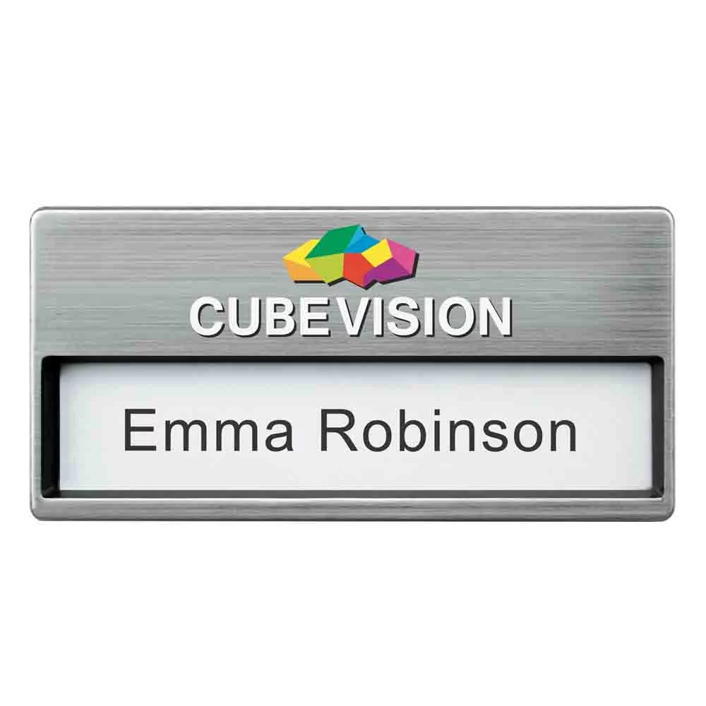 Plaque nominative rectangulaire en plastique avec effet métallique, fixation aimantée et fenêtre pour le nom (interchangeable).
