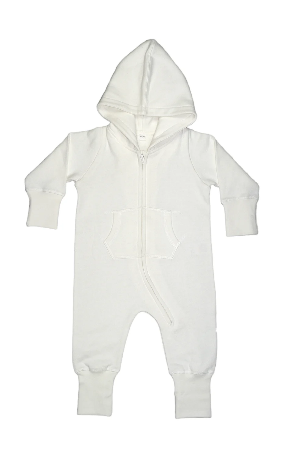 Bébé tout-en-un avec intérieur très doux et moelleux, capuche simple, sellette dans la nuque, bandeau dans le cou, zip du cou jusqu'au bas des jambes pour un habillage et une finition faciles, poche kangourou, larges bords-côtes aux poignets et aux chevilles, facile à réétiqueter.