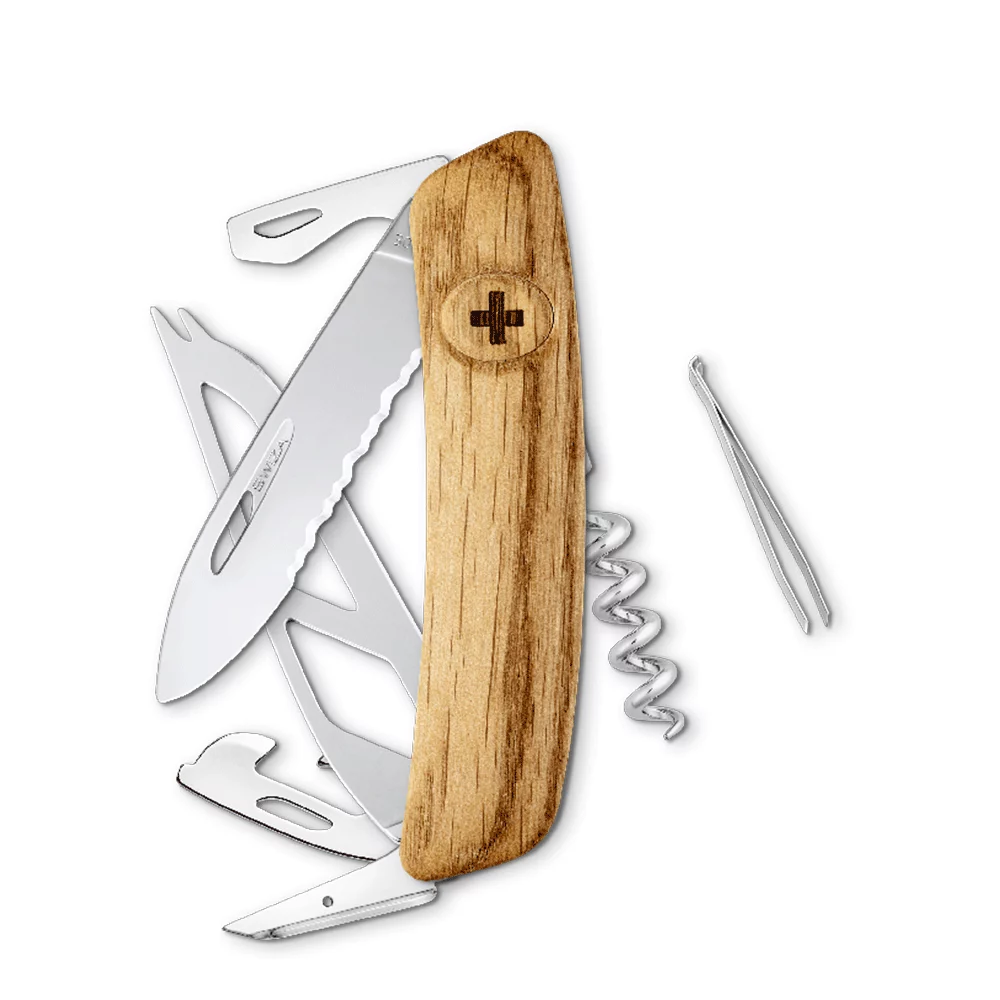 Fonctions : 1 lame à fromage, 1 lame dentée, 1 tire-bouchon, 1 décapsuleur avec tournevis (n° 3), 1 plieur de fil, poinçon et perceuse avec chas d'aiguille, 1 ouvre-boîte avec tournevis (n° 1), 1 pincette, 1 anneau et 1 fermeture de sécurité.