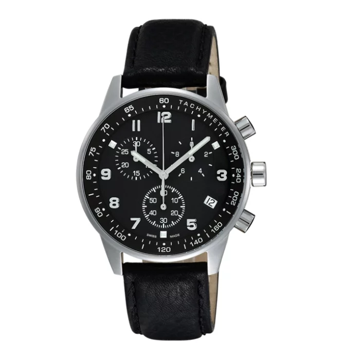 Swiss Made Chronographe Verre minéral Boîter acier plaqué Etanche jusqu'à 50 m Mouvement quartz Date Bracelet cuir Cadran noir Finitions spéciales telles que bracelet en acier ou cuir et boîte d'emballage de qualité suppérieur disponible sur demande en supplément de prix!