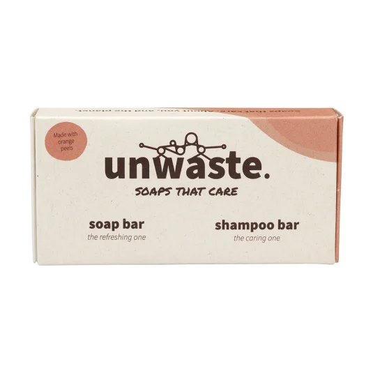 Durable et naturel - Made in Holland ! Set savon & shampooing en barre fabriqué à partir de déchets d'écorce d'orange, végétalien, non testé sur les animaux et sans microplastique, livré dans un emballage écologique fabriqué à partir de déchets agricoles.