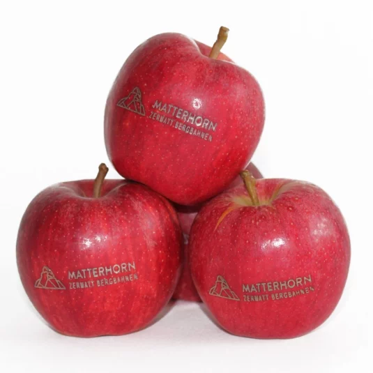 Directement récoltées au verger. Snack sain et juteux, avec votre message imprimé dessus ! Pommes rouges suisses (Jonagold) issues de l’arboriculture fruitière contrôlée, fournies par plateaux en carton de 30 pièces. Alternative avec pommes vertes (par ex. Granny Smith) ou autres aliments comme des oranges, des mandarines ou des œufs, sur demande, commande min 120 pièces