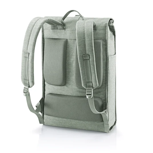Sac à dos Rolltop élancé en polyester 100 % recyclé et hydrofuge, avec grand compartiment principal incluant un compartiment pour ordinateur portable, une poche frontale zippée, une poche latérale, un dos rembourré et des bretelles, contenu 16 l