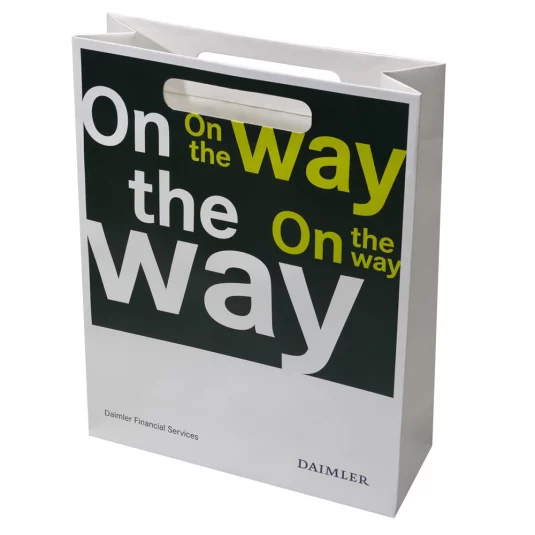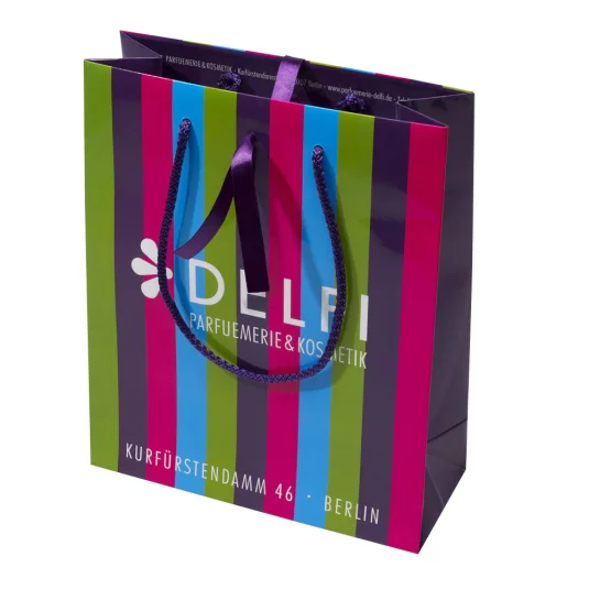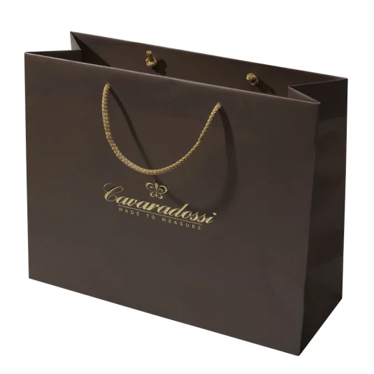 Klassische Boutique-Tragtasche aus Kraftpapier 200 gm2 (matte oder glänzende Oberfläche lieferbar), mit Textil-, Papier- oder Polyproplenkordeln erhältlich, verstärktem Randumschlag und eingelegtem Bodenkarton, erhältlich in verschiedenen Formaten, Mindestbestellmenge 500 Stück