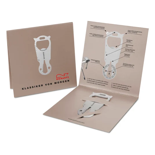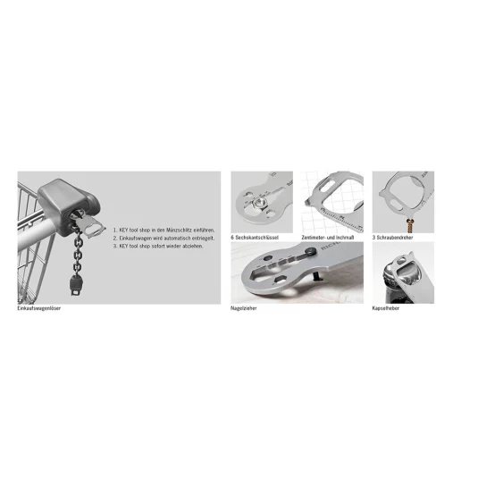 Praktisches Multifunktionstool aus hochwertigem, matt gestrahltem Edelstahl, mit 14 Funktionen; Einkaufswagenlöser, Kapselheber, zwei Schlitzschraubendreher, Kreuzschraubendreher, sechs Sechskantschlüssel, Zentimetermass, Inchmass, Nagelzieher.