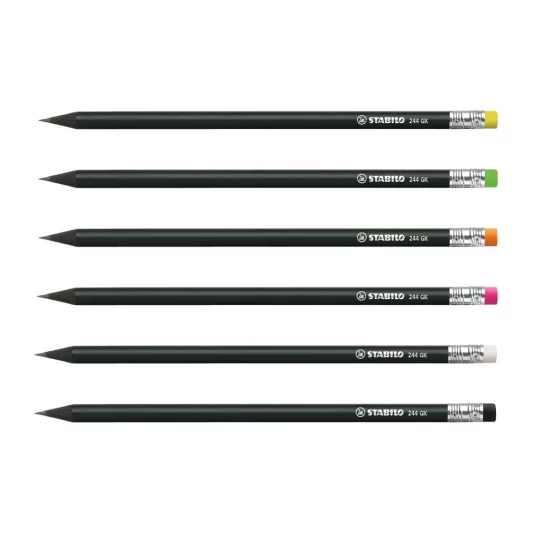 Eleganter, runder Bleistift mit Radiergummi, aus schwarz durchgefärbtem Holz mit matter Lackierung, Metallhülse in Gold, Silber oder Schwarz, auch ohne Radiergummi erhältlich (Preise auf Anfrage), Mindestbestellmenge 1000 Stück