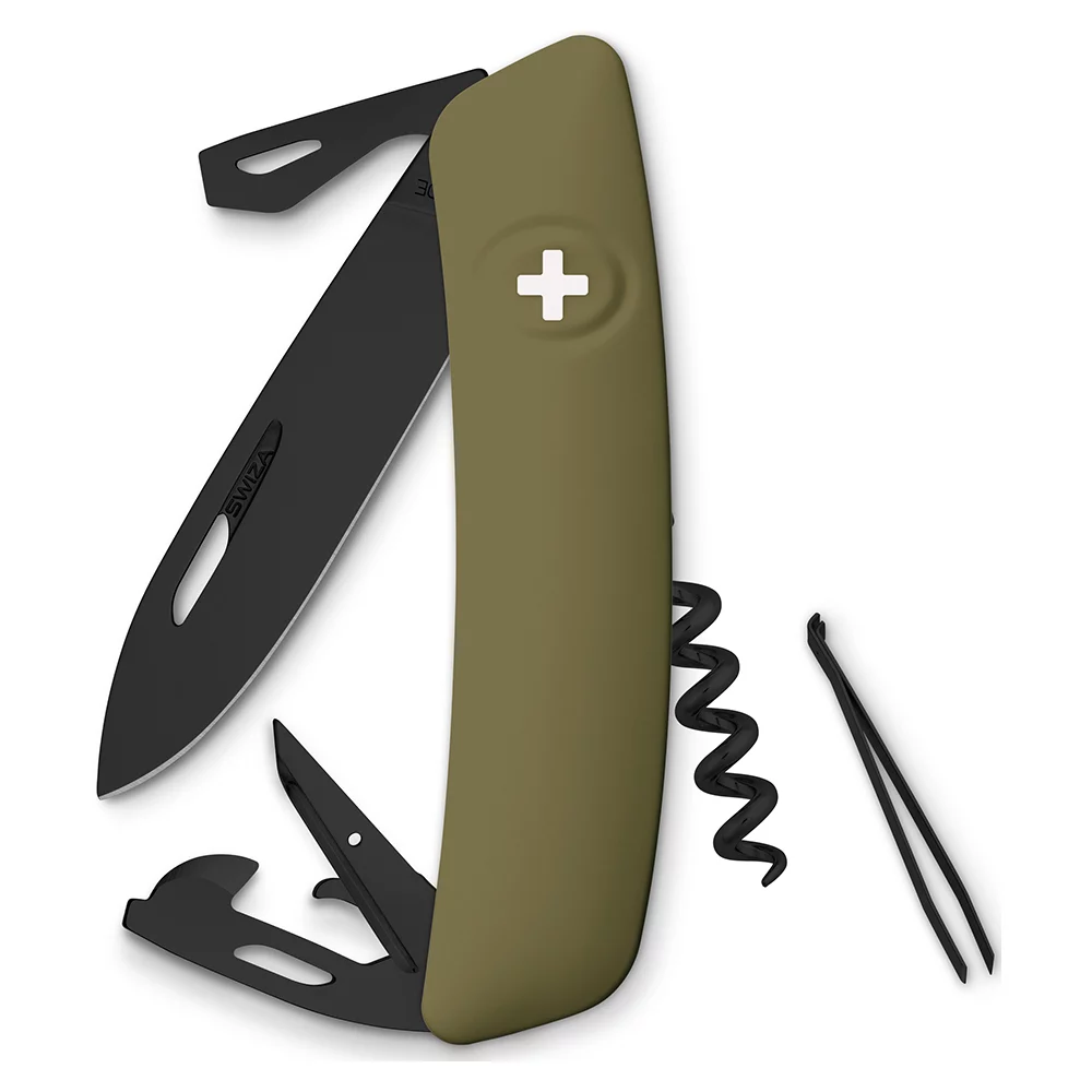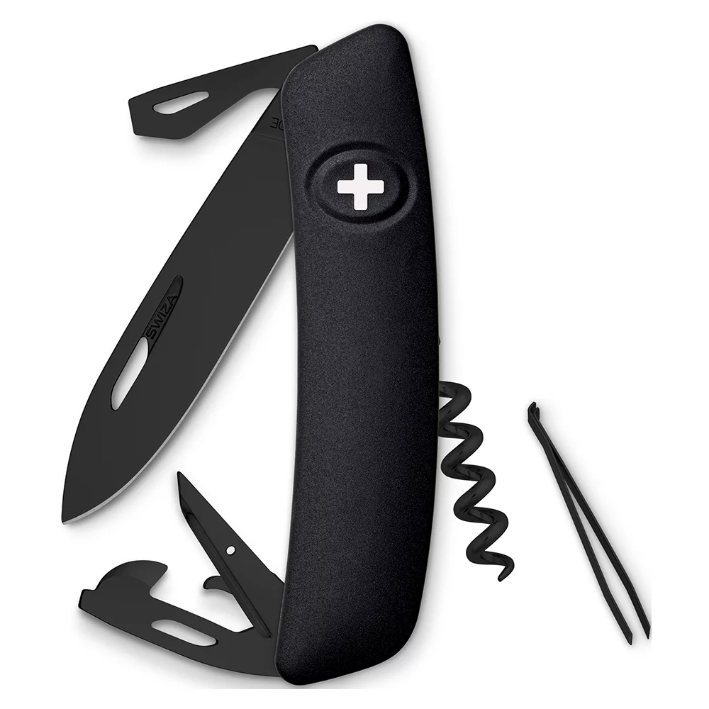 Swiss Made, in edlem Design - mit extra starker Klinge (75mm) aus rostfreiem Edelstahl (440/ 57 HRC) mit einer hoch widerstandsfähigen, tiefschwarzen Hightech-Beschichtung sowie angenehmer, robuster Soft Touch (Anti-Rutsch) Oberfläche - präsentiert sich dieses Kultobjekt Funktionen: Messer, Stech- und Bohrahle, Nähahle, Flaschenöffner, Drahtbieger, Dosenöffner, Schlitzschraubendreher Nr.