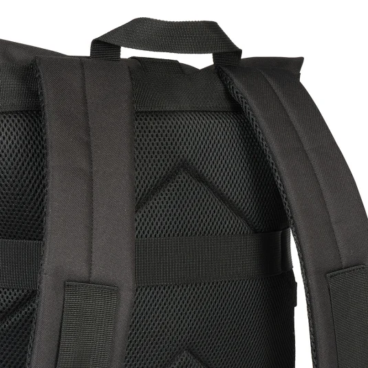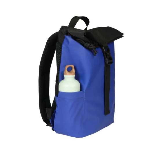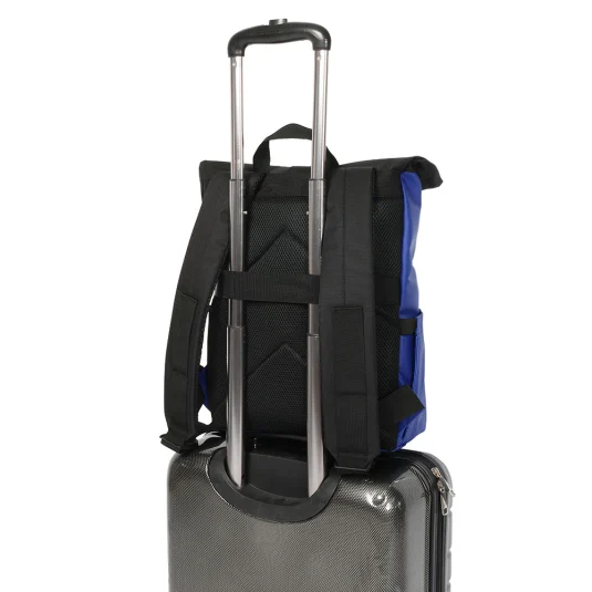 Urbaner Rucksack aus Tarpaulin und Polyester mit grossem Hauptfach, zusätzlichem Laptopfach, zwei Seitentaschen, Rückenpolster, einer Schlaufe zur Befestigung am Trolley sowie bequemen, längenverstellbaren Schultergurten, Mindestbestellmenge 300 Stück