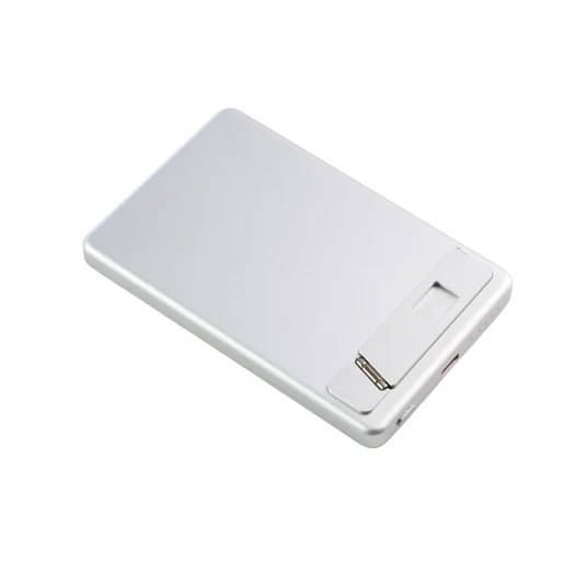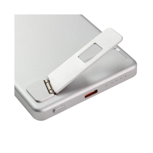 Kabellose, magnetische Powerbank aus Aluminum, MagSafe-kompatibel; unterstützt kabelloses und kabelgebundenes Laden, mit ausklappbarem Metallständer für horizontales und vertikales Aufstellen des Smartphones, wird inklusive USB-C-Ladekabel geliefert