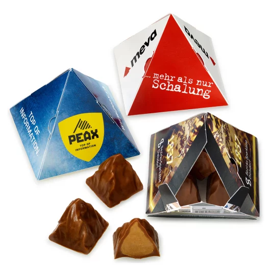 Swiss made - 5 Pralinen (à ca. 7,6g) in Swiss-Mini-Mountain-Form aus Schweizer Premium Milchschokolade mit feinster Giandujafüllung und gerösteten Mandeln, geliefert in rundum individuell bedruckbarer Pyramiden-Kartonage, Haltbarkeit 9 Monate