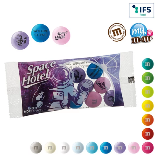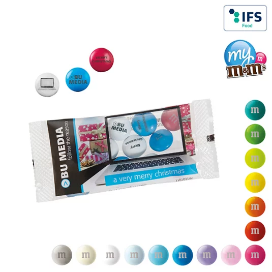 Original Schokolinsen von M&M's®, in 15 verschiedenen Linsenfarben erhältlich (rote und weisse Linsen sortenrein nicht möglich), können mit Ihrer Botschaft (Schriftfarbe schwarz, maximal 2 Zeilen à je 9 Zeichen), Ihrem Firmenlogo oder sogar einem Bild bedruckt werden, geliefert im transparenten Tütchen, Haltbarkeit ca.