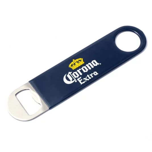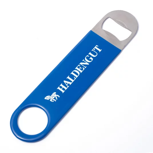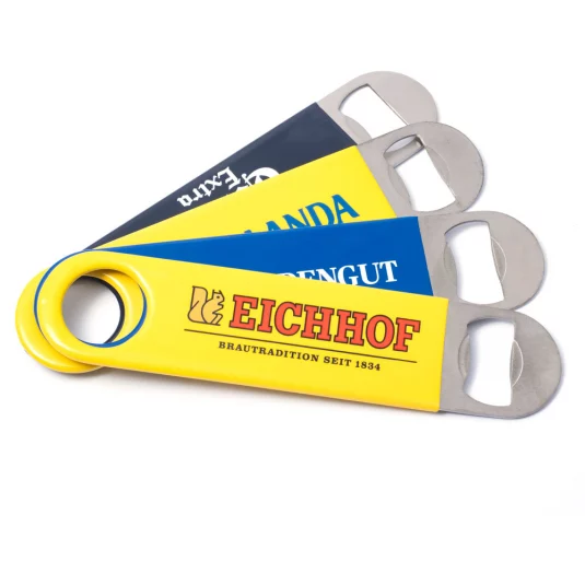 Praktischer Flaschenöffner für den professionellen Einsatz, aus Kunststoff und Edelstahl, Kunstoffteil kann in gewünschter Pantonefarbe eingefärbt werden