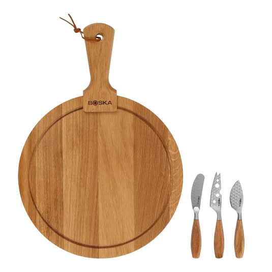 Hochwertiges Set bestehend aus einem edlen Servierbrett aus Eichenholz (EU) und drei dekorativen Mini-Messer, für alle Käsesorten geeignet