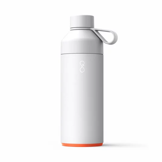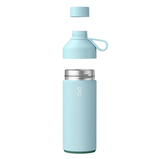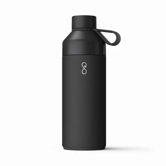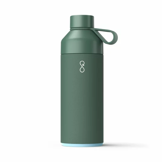 Stop Ocean Plastic! Nachhaltige Trinkflasche aus rostfreiem Edelstahl (65% rezyklierte Materialien inklusive 90% rezykliertem Edelstahl), doppelwandig und vakuum-isoliert, hält Getränke 18 Stunden kalt und bis zu 6 Stunden warm, mit zwei Öffnungen für einfacheres Einfüllen und Auswaschen, auslaufsicher und mit praktischer Trageschleife, 100% spülmaschinengeeignet, geliefert im Einzelkarton (100% rezykliertes Material), Inhalt 1 l