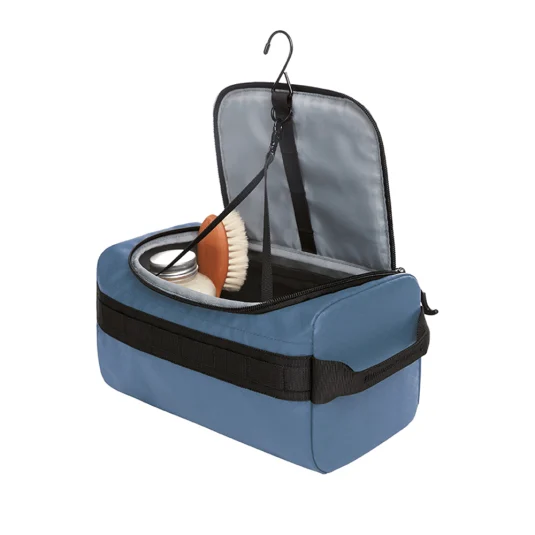 Gepolsterte Kulturtasche aus rezykliertem PET, mit Reissverschluss- und Netzfächern sowie funktionalem Schlaufenband, zum Aufstellen oder Aufhängen