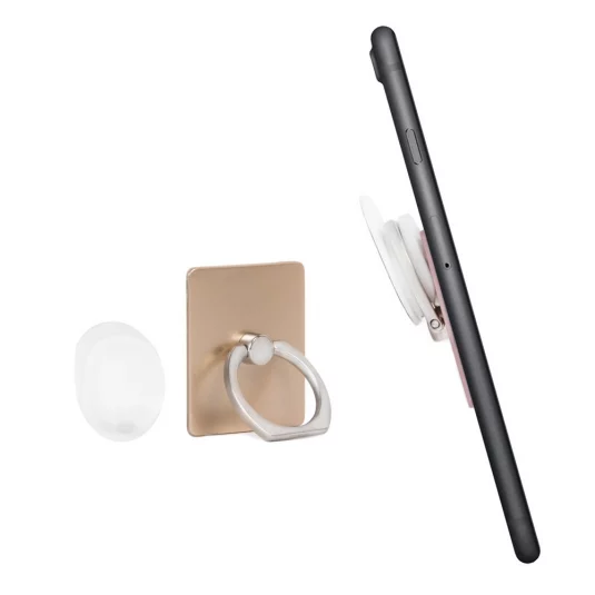 Praktischer Smartphone- und Tablet-Ring aus Metall und Kunststoff, zum sicheren Tragen am Finger oder zum Aufstellen auf dem Tisch - der Ring ist 360°Grad drehbar und lässt sich rückstandslos entfernen, Mindestmenge 200 Stück, ab 1500 Stück Pantone-Einfärbung möglich (Preise auf Anfrage)