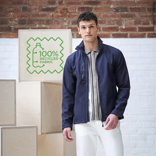 Jacke aus 100% recyceltem, gewobenem Softshell-Gewebe. Dieses tolle Modell besticht durch seine warme Rückseite und ist zudem noch wasserabweisend, windabweisend, hat einen superweichen Griff und ist schnell trocknend. Eine Brusttasche mit Reissverschluss, Zwei untere Taschen mit Reissverschluss bieten Verstauungsmöglichkeiten.