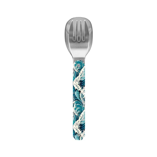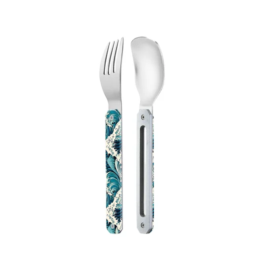 Leicht zusammenfügbares magnetisches Besteck aus hochwertigem, rostfreiem Edelstahl mit Griffen aus dekoriertem, transparentem Kunststoff, wird inklusive Hartschalen-Etui geliefert