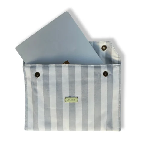 Swiss Made & Upcycled! Trendige, langlebige und gepolsterte Laptop-Tasche (bis 14 Zoll) mit Druckknöpfen, hergestellt aus alten, lokalen und wasserresistenten Sonnenstoren, mit viel Sorgfalt in gemeinnützigen Schweizer Stiftungen handgemacht