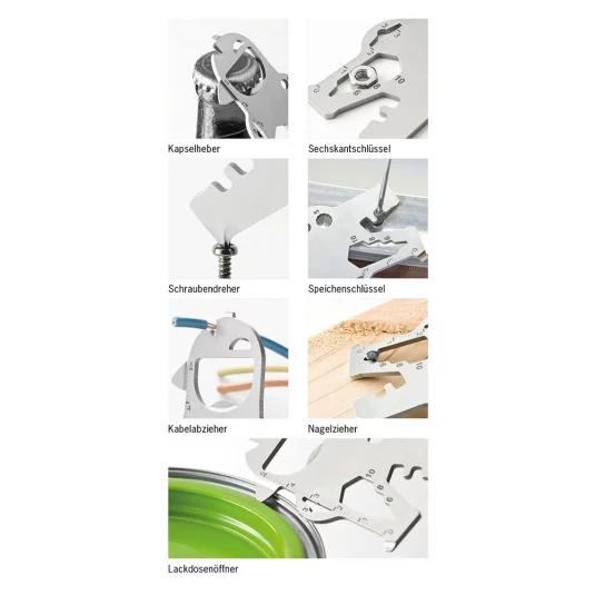Sympathisches Multifunktionstool aus hochwertigem, matt gestrahltem Edelstahl, mit 17 praktischen Funktionen; Kapselheber, zwei kleine Schlitzschraubendreher, Kreuzschraubendreher, Kabelabzieher, zwei Fahrradspeichenschlüssel, drei Sechskantschlüssel, drei Vielzahnschlüssel, Zentimetermass, Inchmass, Lackdosenöffner, Nagelzieher