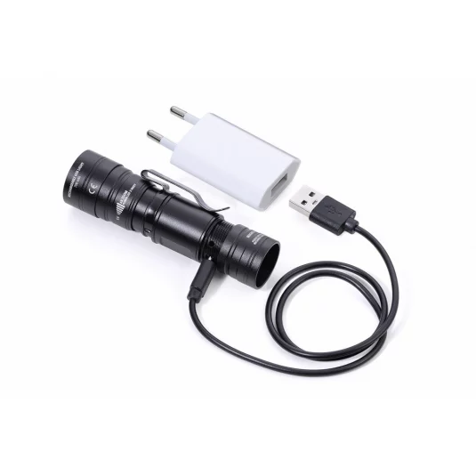 Starke LED-Taschenlampe (240 Lumen) aus Aluminium/Stahl, mit 3 Leuchtfunktionen; 2 Lichtstärken und Blinklicht, sowie 6-fach Zoom und Magnetfunktion, wiederaufladbar mittels integrierter USB-C Ladebuchse, wird mit USB-Ladekabel (USB auf USB-C) geliefert