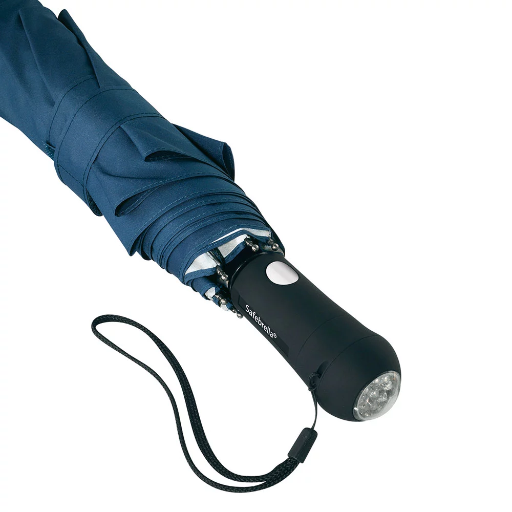Praktischer, leichter Taschenschirm mit Polyesterbespannung und hochwertigem Metallgestell, an den Keilenden ausgestattet mit reflektierendem 3M™ Reflective Material, mit schwenkbarem LED-Leuchtkopf und Druckknopf für automatisches Öffnen, verpackt in Hülle mit praktischem Verschlussknopf