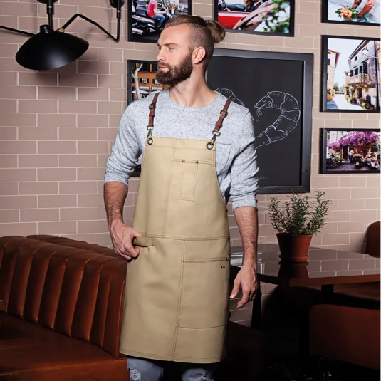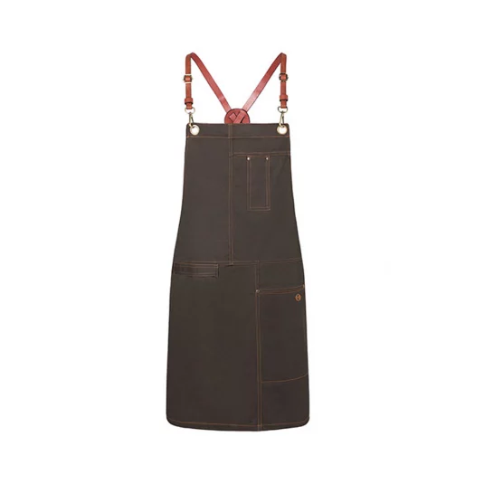 Stylisch-trendige Latzschürze in Twill-Optik mit Kreuzträgern zur Entlastung des Nackens. Einfaches Abnehmen und Befestigen aller Bänder mithilfe von Karabinerverschlüssen. Schnallen zum stufenlosen Einstellen der Länge. Zusätzliches Taillenband zum Regulieren der Weite garantiert einen festen Sitz. Bronzierte Nieten und kontrastfarbige Steppnähte sorgen für einen unverwechselbaren Urban-Style. Funktionale Bänder aus Echtleder, praktische Stoffschlaufe auf der rechten Seite zum Befestigen eines Kassierhalfters oder Geschirrtuchs, linksseitige Tasche (16 x 24 cm) und Stiftfach auf Brusthöhe.
