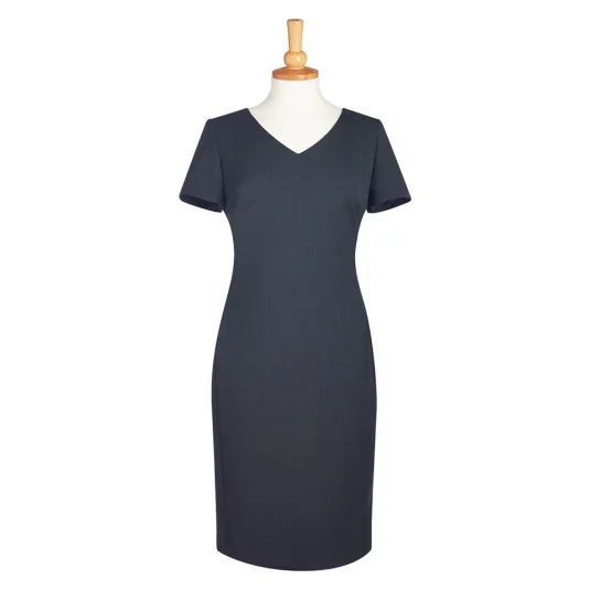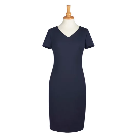 Elegantes Kleid mit V-Ausschnitt, kurzen Ärmeln, Rückenschlitz, Stretch Futterstoff, maschinell waschbar und knitterarm.