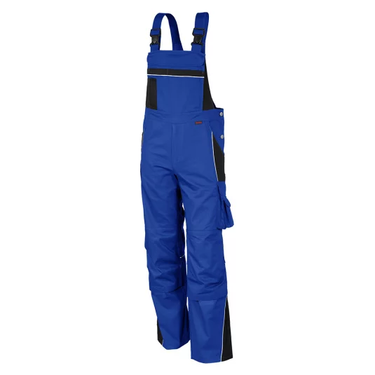 Latzhose mit Reflexpaspeln, Hosen mit YKK Metallreissverschluss, Vorgeformte Knie und Knietaschen mit Klettverschluss, elatischer Stretcheinsatz unter Knietasche, Brustlatz mit aufgesetzten Latztaschen, 2 eingesetzte Vordertaschen, eingearbeitete Leistentasche, 1 Oberschenkeltasche, 2 Gesässtaschen, Hammerschlaufe.