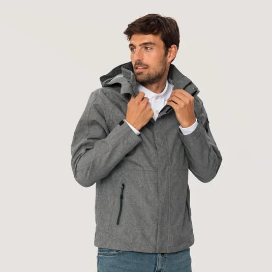 Atmungsaktive, wasser- und winddichte Kombijacke mit getapten Nähten, abnehmbarer und regulierbarer Kapuze, verlängerter Rückenteil, hochwertigem 2-Wege-Frontreissverschluss und wasserdichten Reissverschlüssen an den Taschen.