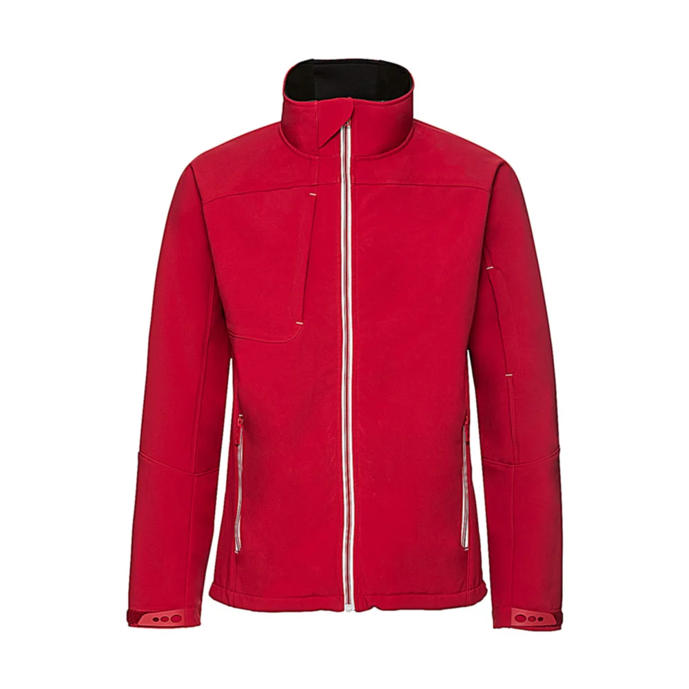 Bionic-Finish® Eco (3-lagige Softshell mit hydrophober Membran), Fluor und PFC frei, Wind- und wasserdicht (5000 mm), Atmungsaktiv (5000 g/m² in 24h), Stehkragen, Hydroshell Air Einsätze im Achselbereich, Brust-, Arm- und Seitentaschen mit Zip, Media-Netztasche innen, verstellbare Ärmelbündchen.