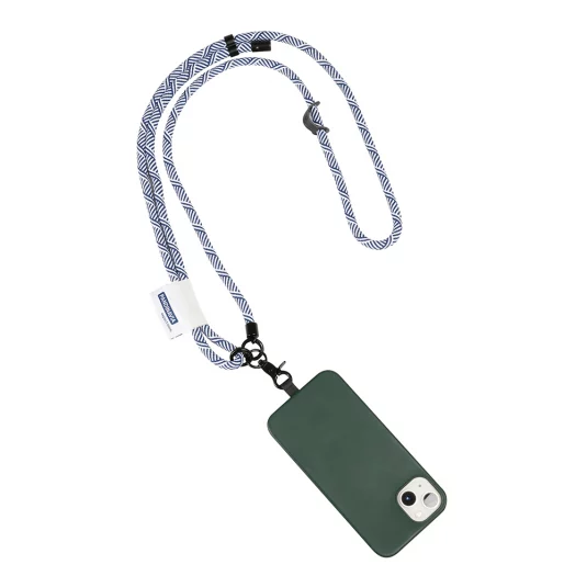 Innovative, längenverstellbare Handykette kompatibel mit jeder Handyhülle, aus Polyester mit 2-farbig gewobenem Band, Sicherheitsverschluss und Karabiner, Mindestbestellmenge 300 Stück
