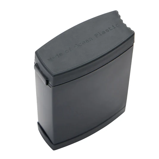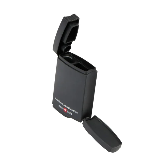 Swiss Made, nachhaltig, innovativ und funktional! Leichter, geruchsdichter und ausschüttsicherer Taschenaschenbecher mit Einhandbedienung, hergestellt aus meeresgebundenem Kunststoff, mit integrierter Auslöschhilfe sowie Deckel an Ober- und Unterseite für die einfache Leerung und Reinigung, Mindestbestellmenge 100 Stück