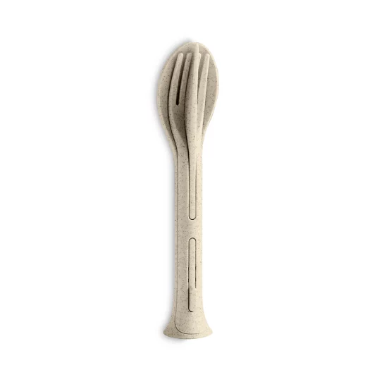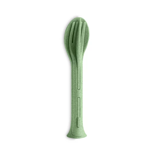 Nachhaltiges To-go-Besteck! 3-teiliges kompaktes und zusammensteckbares Set bestehend aus Löffel, Messer und Gabel, aus thermoplastischem Kunststoff und natürlicher Zellulose, leicht zu öffnen durch cleveres KLIKK-System, lebensmittelecht und spülmaschinenfest