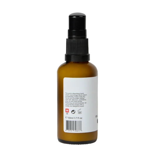Swiss Made Handcreme, aus 100 % natürlichen Inhaltsstoffen, pflegend und schnell einziehend, mit angenehm natürlichem und leichtem Duft, parfümiert mit biologisch angebauten ätherischen Ölen aus Pflanzen extrahiert, befüllt in dekorativer Glasflasche, Haltbarkeit ca.